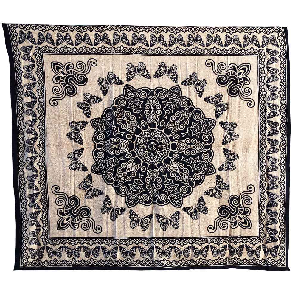 Il Telo Copritutto Grande con stampa Farfalle Nero Sabbiato, è prodotto in India misura 210 x 240 cm, 100% cotone senza frange all'estremità. Le stampe su questi articoli, vengono eseguite a freddo senza ausilio di macchinari e quindi soggette a imperfezioni e sbavature, che fanno dei teli Copritutto, articoli unici. I disegni utilizzati sono i più vari: personaggi famosi, animali di ogni genere, scene di vita quotidiana in villaggi indiani, sole, luna, stelle, fiori, piante, simboli tribali e divinità di ogni Religione e credenza. Si possono utilizzare in moltissimi modi: come copriletto, copri divano, copri tavolo, da appendere come tenda, come arazzo decorativo, da stendere sulla sabbia in spiaggia, in un prato per un fantastico pic nic o come regalo utile e alternativo. Al primo lavaggio è consigliato usare un po' di aceto di vino bianco in acqua fredda, per fissare meglio i colori. Lavare separatamente da altri capi.