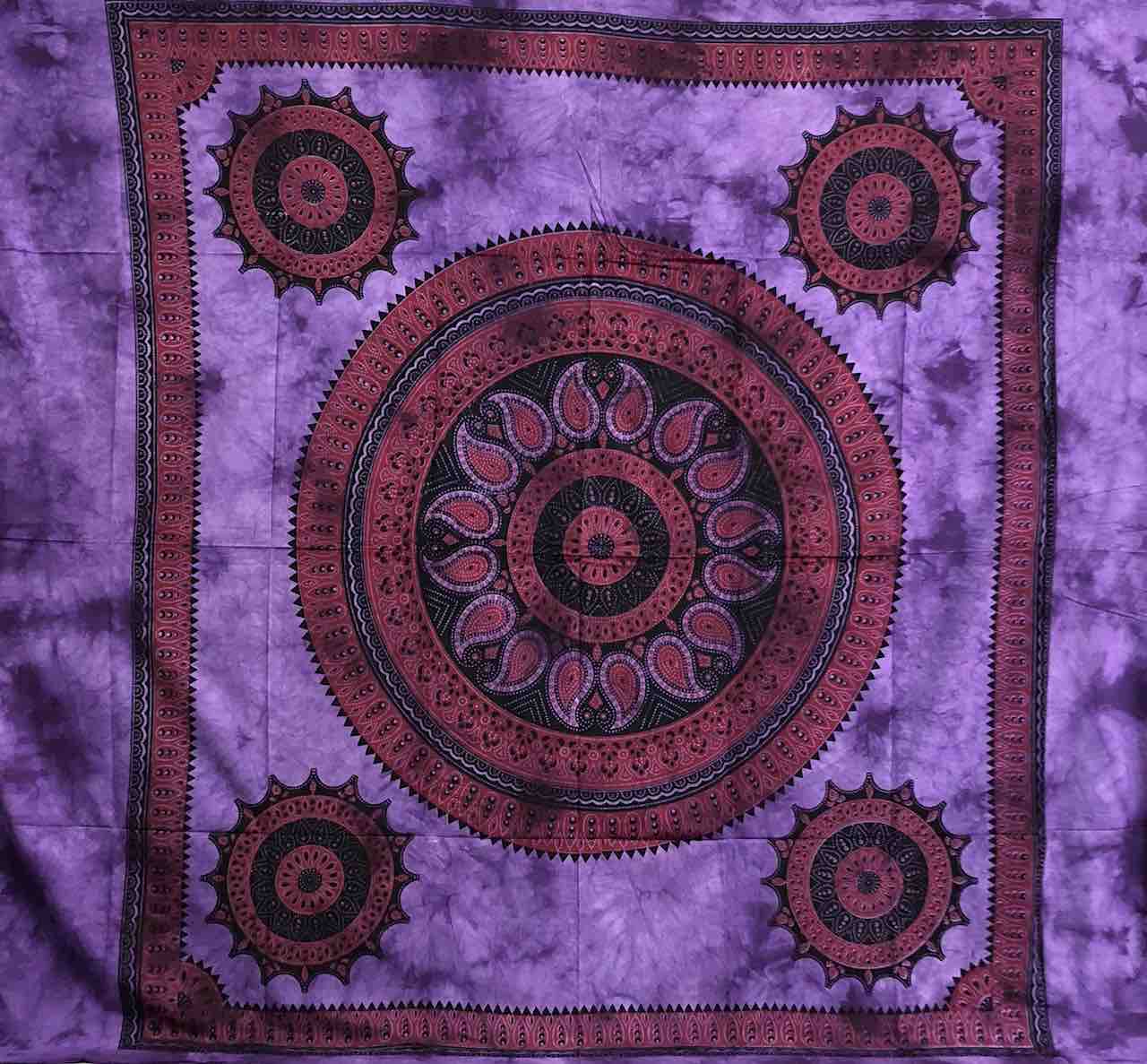 Il Telo Copritutto Grande stampato con disegno Oriente Viola, è prodotto in India misura 210 x 240 cm, 100% cotone con frange alle estremità. Le stampe su questi articoli, vengono eseguite a freddo senza ausilio di macchinari e quindi soggette a imperfezioni e sbavature, che fanno dei teli Copritutto, articoli unici. I disegni che vengono utilizzati sono i più vari, da personaggi famosi, animali di ogni genere, scene di vita quotidiana in villaggi africani, sole, luna, stelle, fiori, piante, simboli tribali e divinità di ogni Religione e credenza. Li potete utilizzare in tanti modi e il nome stesso, copritutto, ne è la comferma, da copriletto, copridivano, copritavolo, parasole, da appendere come tenda, da stendere sulla sabbia in spiaggia o in un prato per un fantastico pic nic. Al primo lavaggio è consigliato usare un bicchiere d'aceto di vino bianco in acqua fredda, per fissare meglio i colori e lavare separatamente da altri capi.