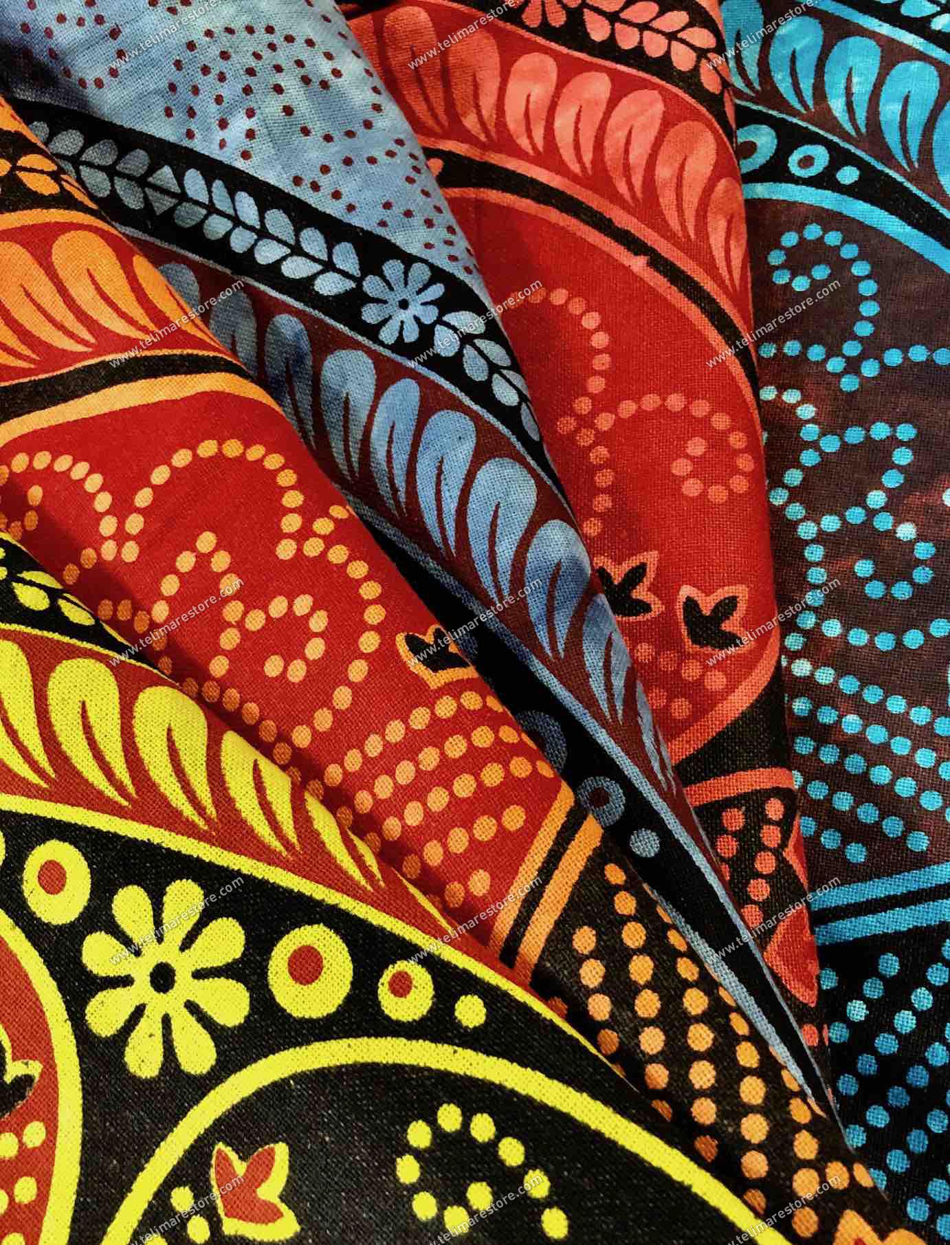 Il Telo Copritutto Medio con stampa Margherita Pasley Azzurro, è prodotto in India misura 140x220 cm 100% cotone con frange a due estremità. Le stampe su questi articoli, vengono eseguite a freddo senza ausilio di macchinari e quindi soggette a imperfezioni e sbavature, che fanno dei teli Copritutto, articoli unici. I disegni che vengono utilizzati sono i più vari, da personaggi famosi, animali di ogni genere, scene di vita quotidiana in villaggi africani, sole, luna, stelle, fiori, piante, simboli tribali e divinità di ogni Religione e credenza. Il disegno di questo copritutto é rappresentato da una grande margherita centrale e tanti elefanti in fila a formare una grande cornice su tutto il bordo del telo. I Teli Copritutto li potete utilizzare in moltissimi modi: come copriletto, copri divano, copri tavolo, da appendere come tenda, come arazzo decorativo, da stendere sulla sabbia in spiaggia o in un prato per un fantastico pic nic. Al primo lavaggio è consigliaro usare un po' di aceto di vino bianco in acqua fredda, per fissare meglio i colori e togliere eventuali odori sbgadevoli. Lavare separatamente da altri capi.