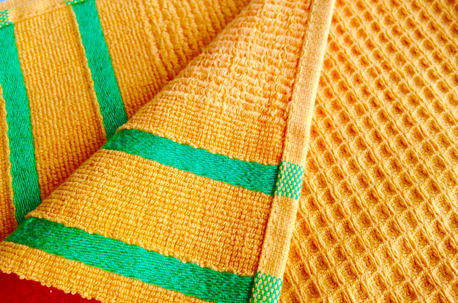 Telo Mare Fouta Nido D'ape cotone spugna Giallo, 100% Cotone, misura 90 x 160 cm più frange. La parte superiore tessuto di cotone nido d'ape, la parte sotto in morbida spugna.