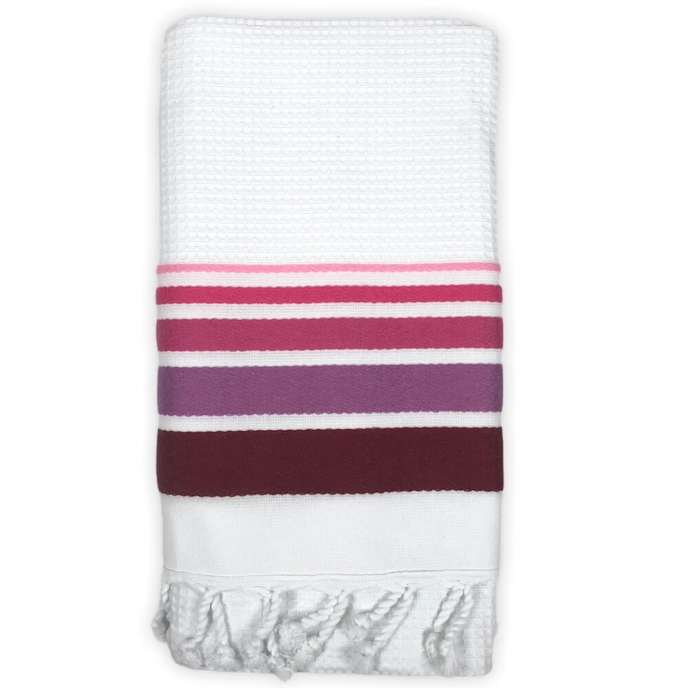 Telo Mare Fouta Nido D'ape cotone spugna Bianco Righe Degrade' Fucsia, 100% Cotone, misura 90 x 160 cm più frange. La parte superiore tessuto di cotone nido d'ape, la parte sotto in morbida spugna.