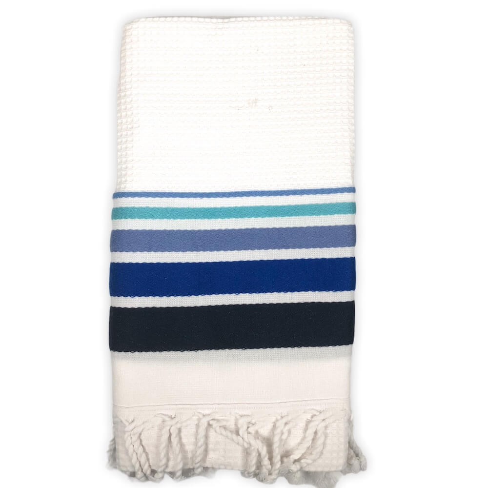 Telo Mare Fouta Nido D'ape cotone spugna Bianco righe Blu Degrade', 100% Cotone, misura 90 x 160 cm più frange. La parte superiore tessuto di cotone nido d'ape, la parte sotto in morbida spugna.